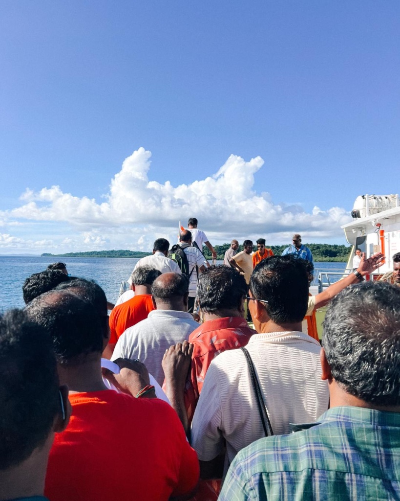 Wow, suur melu ja põnev programm hakkab juba laevas! Ilusates riietes, ilmselt väga rikkad kohalikud. Rahvas seisab ja pildistab. Fotod üksi, kahekesi, kolmekesi, terve perega, liituvad ka sõbrad. Suure reisi esimene oluline hetk tuleb jäädvustada. Kogu mäsu taustaks käib telerist India muusikakanal, kust nähtavad ainult Bollywoodi tantsumuusika parimad palad. Võiksime nüüd kõik koos grupitantsu ka teha. Muusika on väga kaasakiskuv ning rahva tuju vaikselt ülemeelik. Järgmisel hetkel maandub meie kõrvale kohalik naine, kes teatab, et soovib meiega intervjuu teha. Ta kirjutab hetkel oma lõputööd ning tahab vestelda korallrahude teemal. Vastame, et see pole meie tugevaim külg, kuid ta ei jäta jonni. Juba on telefonist saanud diktofon ning esimesed küsimused lendavad meie poole. Kertu vestleb ja arutleb tulihingeliselt. Jutt läheb ka muudele teemadele. Miks ei tehta lõputöid ning ei pöörata tähelepanu Gangese jõe olukorrale või suurele prügiprobleemile. Intervjueerija nõustub, needki on olulised teemad. Hetkel on tema peamiseks südameasjaks korallrahude päästmine, kuna need kahanevad Andamanil suure kiirusega. Üheks põhjuseks toob ta välja selle, et inimesed päikesekreemiga ujumas käivad.
