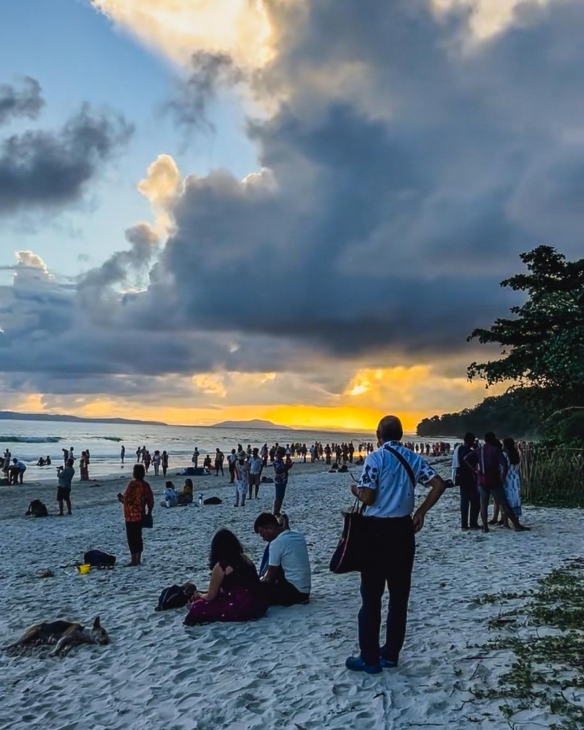Suurelt teelt ranna poole pöörates tabas meid üllatus. Ees seisvad kohalikud noormehed meid randa ei lubanud. Ütlesid, et tänaseks on tee suletud ning edasi ei pääse. Et kui me praegu randa lähme, siis ei jõua me enne pimedat tagasi. Halloo, see on kõigest 2 km ning pimedani on veel aega. Me ei ole aeglased! Teeolud olevat ebameeldivad ning soovitati homme tagasi tulla. Panime kõik läbirääkimisoskused mängu, aga ei midagi. Proovisime isegi joosta. Otsustasime päikeseloojangut oma ööbimise lähedal asuvasse rand nautima minna. Radhanagar Beach oli selle koha nimeks. Loojang möödus vähemalt paarisaja kohaliku India turisti seltskonnas. Tundus, et kõik saare turistid olid siia kokku tulnud. Aga miks mitte, ilmselt oli see parim koht, kust loojangut nautida. Vaade oli imeilus!