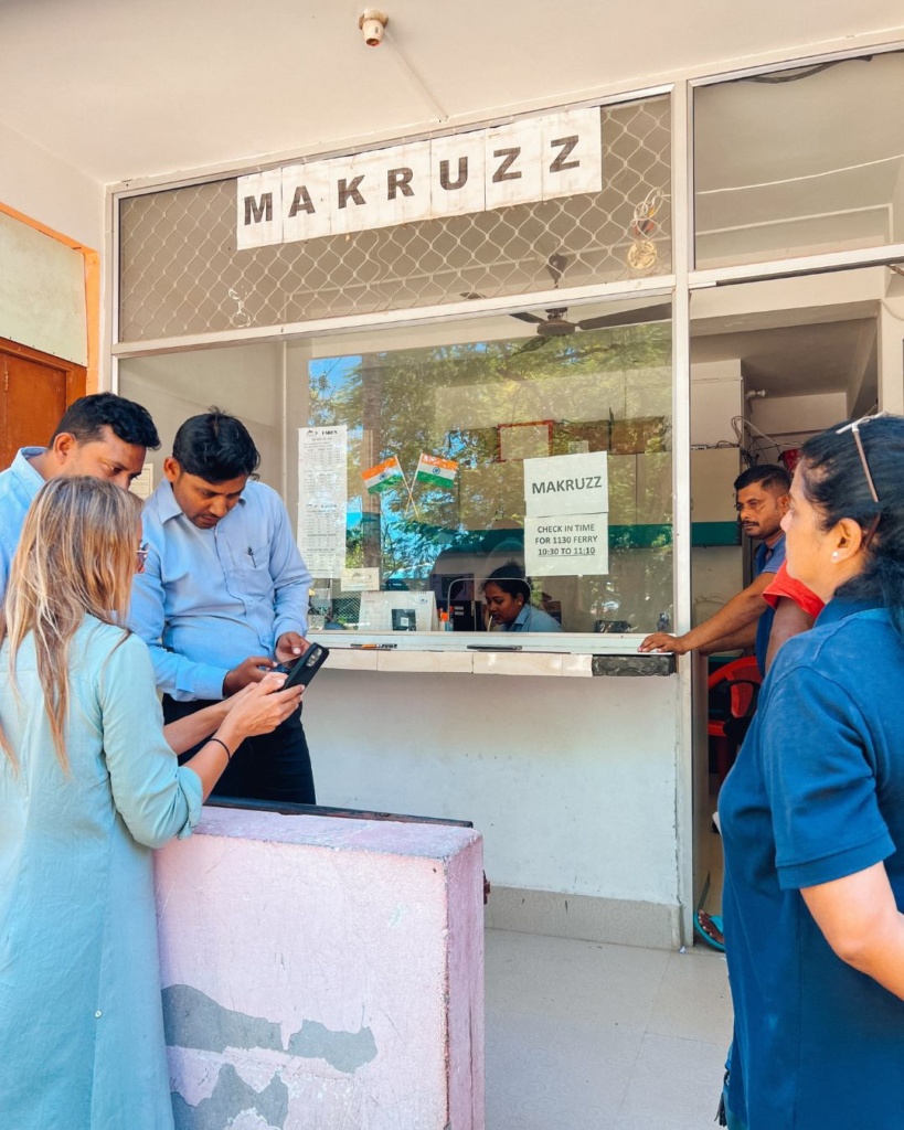 Piletiputkas oli 10 töötajat! Nii suure rahva seest peaks küll ühe inglise keele kõneleja ja kiire abi saama. Leiduski üks! Üks tütarlaps, kes veidi mõikas. Rääkisime oma loo ära. Nad tundusid suht shokis. Et sellist asja pole küll kunagi varem juhtunud. Nendel ülirikastel India turistidel, kes enamasti seda saart külastavad ning terve aja 5* hotellis veedavad, vist tõesti ei juhtu. Pakkusime erinevaid variante – meil on AINULT 7€ ühe pileti (ehk siis Kertu pileti) ostust puudu, palun laske meid laeva. Kertul oli vähem sularaha alles kui minul. Pakkusime, et maksame siis, kui suurele saarele ja sadamasse jõuame. Need variandid ei sobinud. Järeleandmisi nad ei teinud. Kui raha KOHE anda pole, siis laevale ei saa. Õnneks valisime hilisema väljumise. Meil oli veel 5 tundi aega, et nendega vaielda ja pilet välja lunida. Piletiputka töötajad pakkusid, et leiaksime kellegi Indiast, kes meie eest neile 7€ üle saaks kanda. Ühe töötaja isiklikule kaardile. Kust me selle kohaliku veel leidma peaks? Ja töötaja isiklikule kaardile? Tundus väga kahtlane! Aga mida iganes nad soovivad, peaasi, et Kertu pileti saaks! Lõpuks pakkus Kertu, et teeb ise oma Eesti kaardilt neile ülekande. See oli aga programm omaette. Pangaandmete otsimine võttis sada aastat. Esmalt saatsid nad mingi uduse pildi, et vajaliku info sealt võtaksime. Praktiliselt võimatu oli aru saada, mis seal kirjas oli, nii udune. Nõudsime kogu infot loetavas kirjas. Aadress, nimi, mis on IBN, 8 hindut googeldas ja proovis aru saada. 3 korda andsid vale konto nr. 10 töötajat seismas, imestamas ja arutamas. Lahendused olid visad tulema. Lõpuks googeldas Kertu ise nende panga IBNi ja sai tehingu tehtud! Muidugi kahe poisi valvsa pilgu all, kes jälgisid igat sammu. Kuna oli laupäev ja tehing läks Eesti kaardilt India omale, siis tuli saata ka screenshot, mis tõendaks tehingu toimumist. Järgmise sammuna tuli täita paber oma andmetega. Kõige viimane lahter oli kommentaaride jaoks. Säästsin sadamatöötajaid selle täitmisest ning kirjutasin Kertu nime taha POOR.