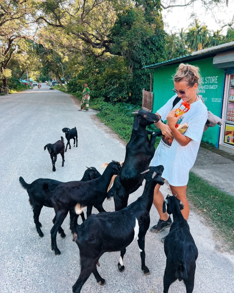 Niel island oli hoopis teistsuguse olekuga kui eelmised saared. Pisike, justkui omaette maailm. Puututama turisti poolt. Külastajaks enamasti India mandri kohalik rikas, kes suurema osa ajast oma 5* hotellis veedab. Sadamast saarele viis pikk sild, ilmselt mõõnade pärast, mis sildumiskoha tihti kaldast kaugele viib. Hüppasime ühe kohaliku mehe käru peale ja lasime end silla lõppu viia. Saar oli tõesti pisike. Tuk-tukid turiste ootamas, kribud koerad lootusrikkalt meie poole vaatamas. Kohalikud müügiputkad kooksosehunnikute all viimase vindi peal püsti seismas. Esimese asjana ostsime kohalikult mehelt kookost, 50 eurosenti tükk. Imehea! Joome nüüd iga päev ühe kookose, leppisime kokku! Seejärel astusime sisse kohalikku poodi, kust koertele süüa sai. Küpsis oli ainus mitte vürtsikas toit, mis sealt saada oli. Kertu asus ühte toitma. Peagi liitus teine, kolmas, neljas. Kohal olid ka kitsed. Üle kümne looma küpsiste nimel võitlemas. Sobis ka kookosekoor, kust käpaga valge osa välja kraabiti ja innukalt nahka pisteti. Selline nälg, kõhud nii tühjad. Midagi ikka said. Loodetavasti annavad teised ka. Jalutasime päikeseloojangu poole, koerad meil mõnda aega kannul, lootes enamale.