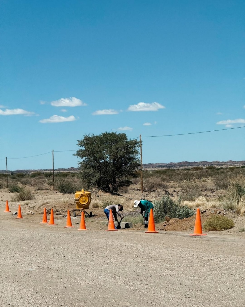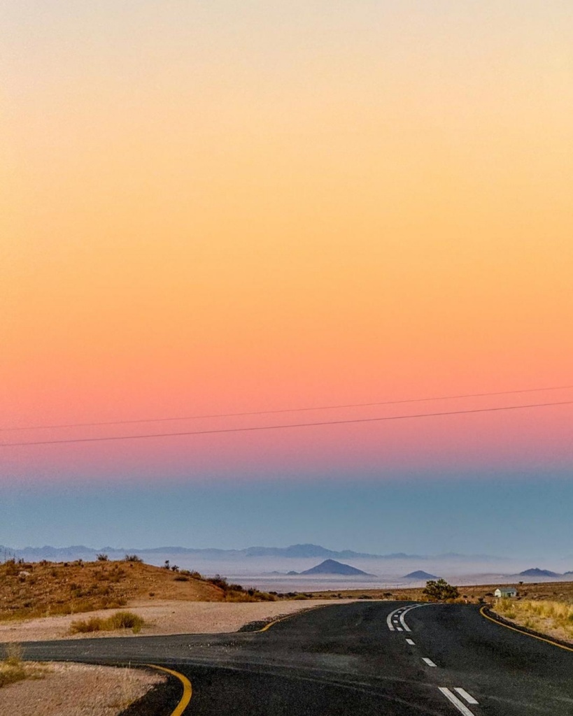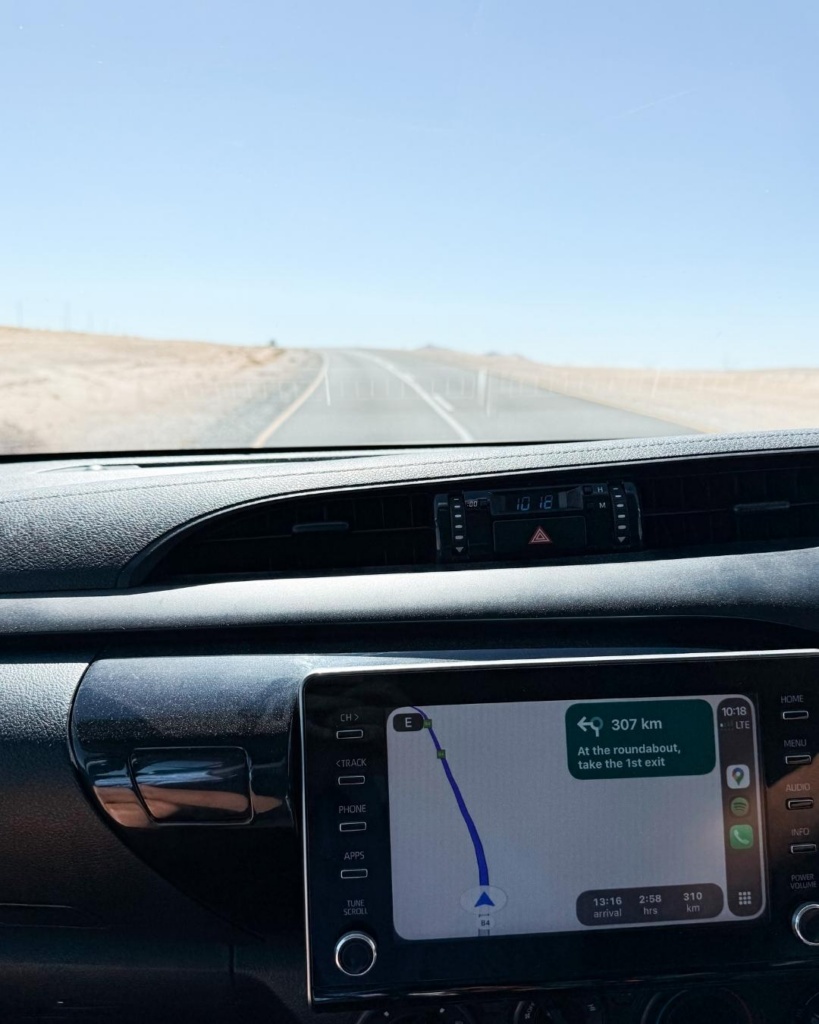Lahkusime varahommikul Ausist. Sooja oli 15 kraadi ning loodus imeilus! Tõusev päike oli taevalaotuse lillakas-roosakaks maalinud. Kogu horisont oli nagu pehme suhkruvatiga kaetud. Kuna olime eelneval päeval palju mööda üsna kehva kruusateed sõitnud, siis tuli täna hommikul ka rehvid natuke rohkem õhku täis lasta. Selleks on meil autorendist spetsiaalne masin kaasas. Lisaks ka väike aparaat, mis rehvirõhku näitab. Ees ootas 120 km sõitu. Kui tee on kehv, nt kruusane, siis tuleb rehvidest rõhku välja lasta. Kui aga asfalt, siis juurde lasta. Selline mängimine käib kogu aeg. Ainus salapärane element on see, et kunagi ei tea, mis tee ees ootab. Isegi, kui näitab, et ees ootab 150 km otse sõitu ning esimesed paar kilomeetrit on asfalt, võib järgmise käänaku taga vabalt kruusatee oodata. Selle tarbeks tuleb rehvid taas tühjemaks lasta. Seiklus igatahes.