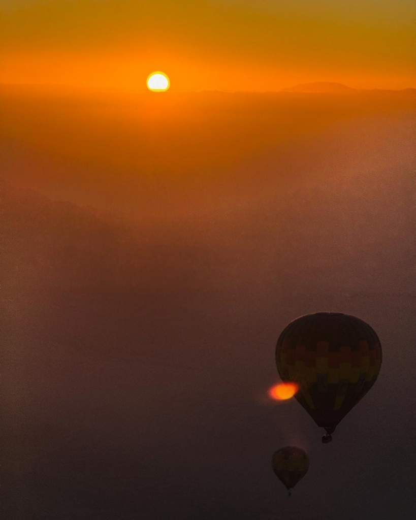 Denis kutsus meid oma “kontorisse”. Oh, wow. Selline kontor on kui unistus! Saime loa palli hüpata. Denis mainis igaks juhuks ka ära, et tegu on lennureisiga, kus suitsetamine keelatud ning varuväljapääsud jäävad igasse suunda, haha. On ju head naljad tal! 😃 Teised kaks pallikest olid juba liikuma saanud. Meie tõusime vaikselt kannule. Kohe, kohe tõusva päikese kuma oli taevalaotuse juba kollakaks maalinud. Horisodil laiuv uduloor andis sellele kõigele aga veel omakorda maagilise puudutuse. Kaugenesime all olevast maapinnast, tõusime aina kõrgemale ja kõrgemale ning siis hõljusime taevalaotuses. Nägime all ka loomakarja oma hommikust kõhutäit nosimas, eemal kõrgusid mäed.