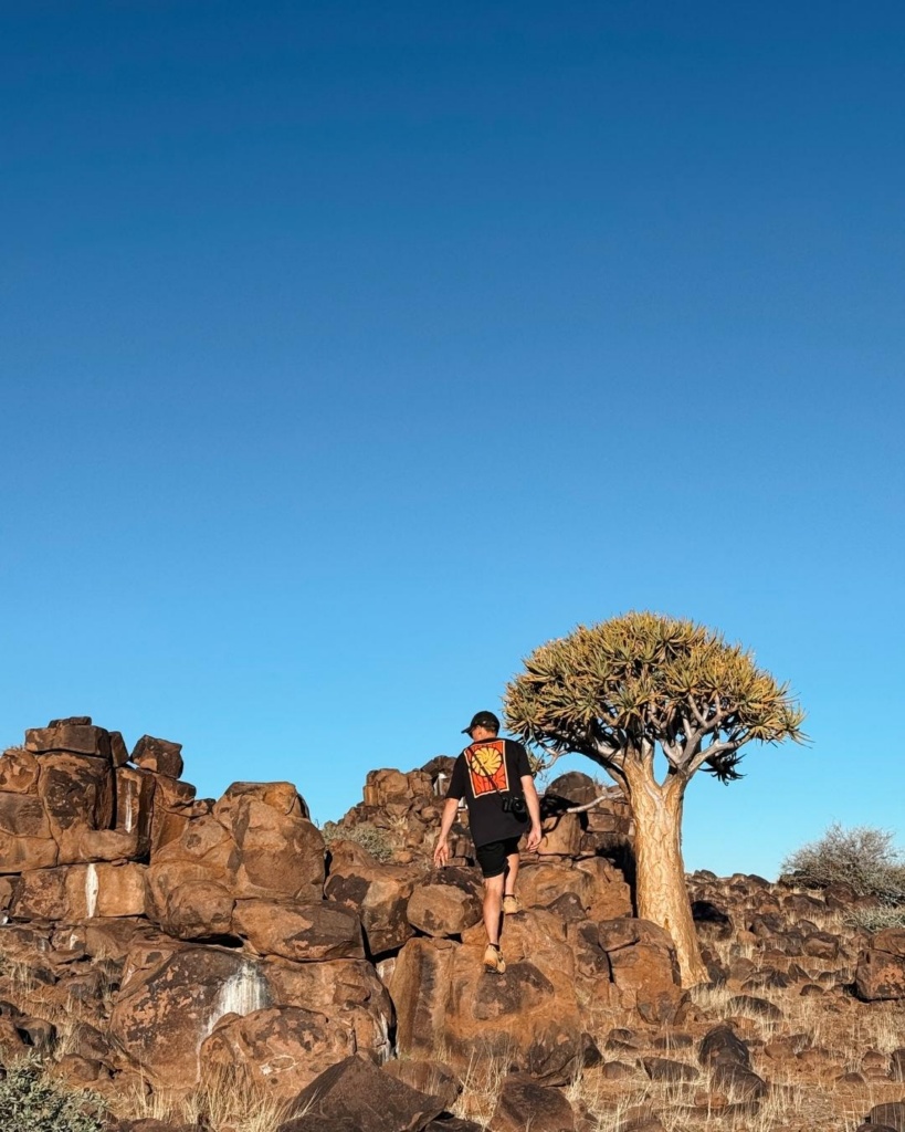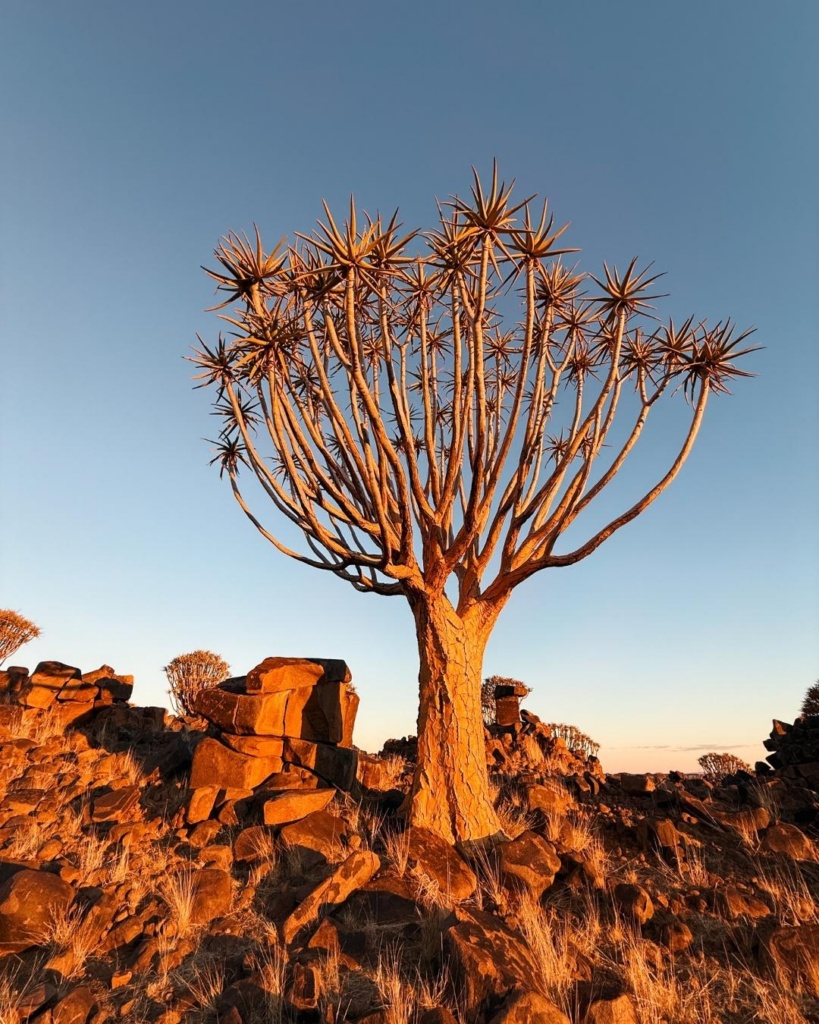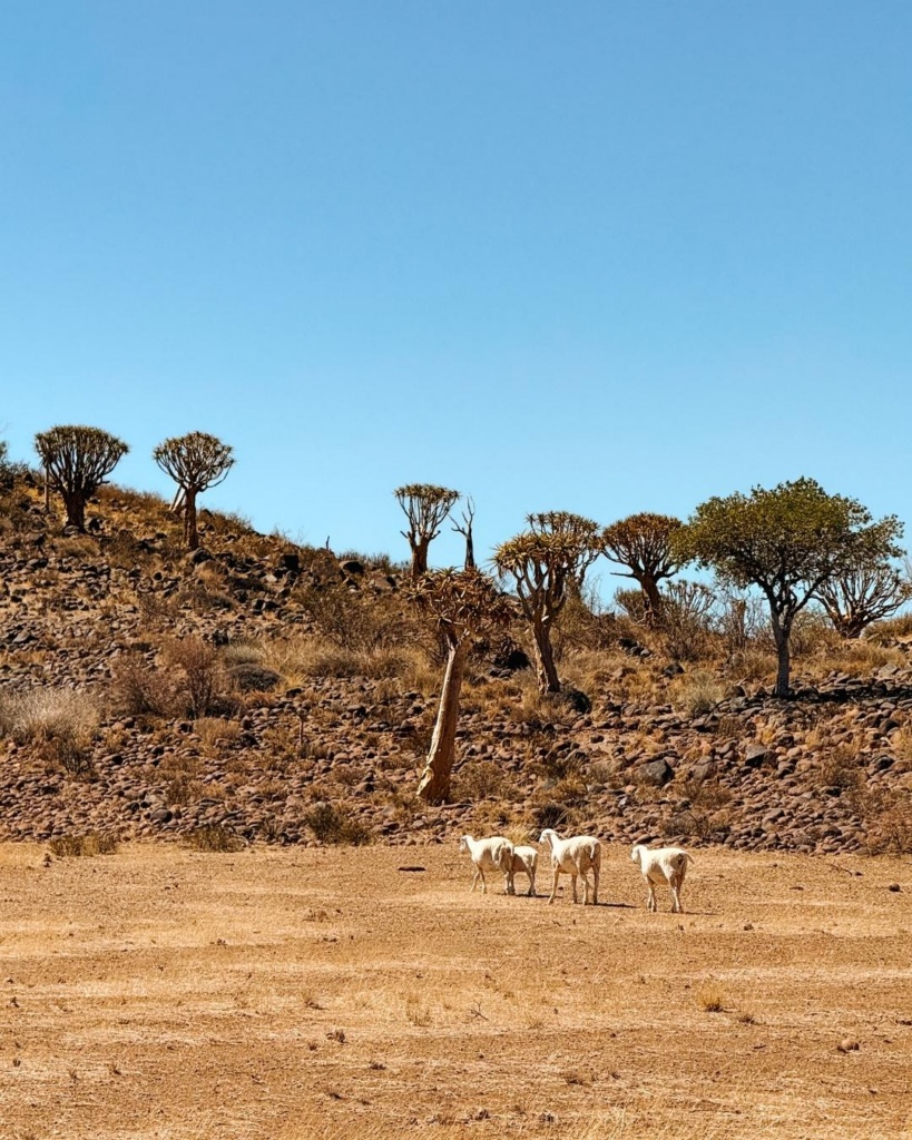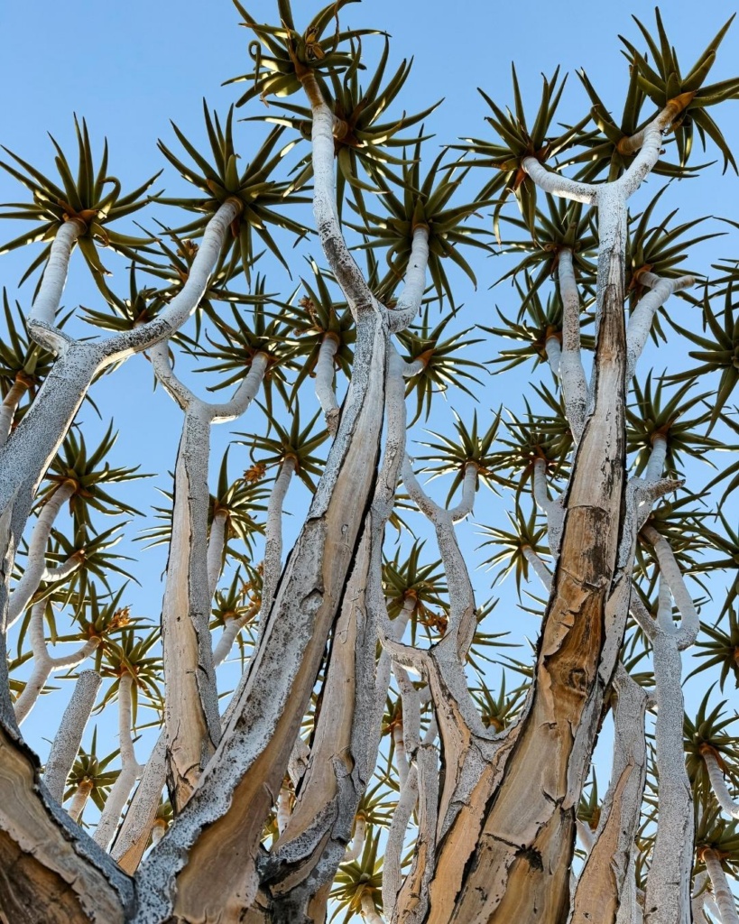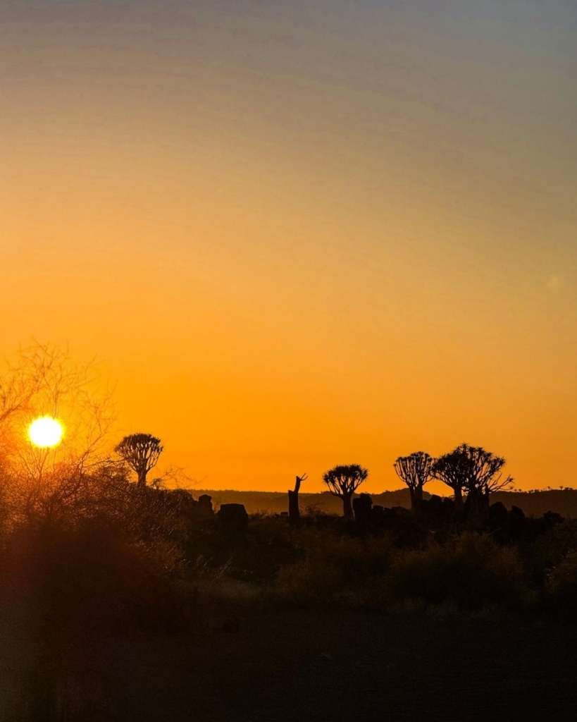 Temperatuur tõusis taas märgatavalt. Sisemaal on ikka totaalne kuumus. Kohtasime taas mitmeid kitsi, lehmi ning jaanalinnuperekondi. Lisaks ka teetöölised, kes põrgukuuma trotsides midagi teeservas nokitsesid. Palavus oli meeletu. Auto mõõdik ütles, et väljas on 37 soojakraadi. UV indeks näitas 14, üle kümne olevat juba ekstreemne, seitse aga väga kõrge! Kui akna avasid, said koheselt sooja tuulepahvakaga vastu nägu. Mõned üksikud külad jäid küll teele, kuid needki pisikesed. Meie tänane ööbimine asub kohalikul kämpingualal. See on maagiline paik, mis on koduks rohkem kui 250 noolepuule. Kohalikud olevat kunagi selle puu oksi nooleviu valmistamiseks kasutanud. Mets olevat sinna kasvanud iseenesest ning kõrgemad noolepuud pidavat olema 2-3 sajandit vanad. Lisaks räägitakse metsaga seoses mitmeid rahvalugusid. Noolepuud pidavat tooma õnne kõigile, kes puud kummardavad ja selle eest hoolitsevad. Kuna Namiibiast on leitud teemante, siis räägitakse, et kui üks neist puudest üles kaevata, leiaks sealt alt ka just nimelt neid ihaldatud kivikesei. Aga kuna puud on õnnistatud, ei taha keegi neid üles kaevata.