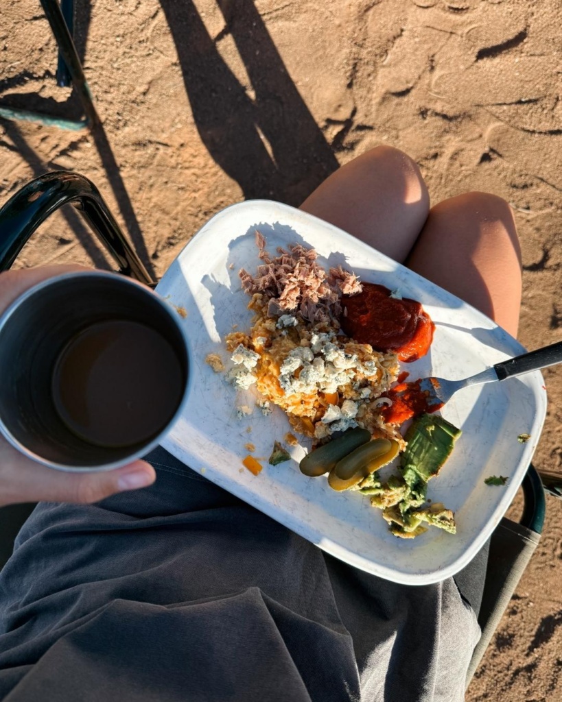 Ärkasime vara. Päikesetõus telgi uksest sisse piilumas. Taevaservas oli nii kaunis oranžikas kuma. Päike oli juba hoogsalt esimesi kiiri taevalaotusele saatmas. Lambad olid juba ammu üleval. Patseerisid noolepuude vahel ning tegid juba mitmendat hommikust tiiru. Nii reibas samm oli sees. Oli aeg hommikukohviks ja -söögiks! Mina pesin eilsed nõud ning Alvar pani gaasipliidile hääled sisse. Lõpetasime eilse õhtusöögi kottpimedas ning nõudepesust ei oleks midagi välja tulnud. Lükkasime selle meeldiva tegevuse hommikusse ning võtsime eilsest tähistaeva vaatlusest viimast.