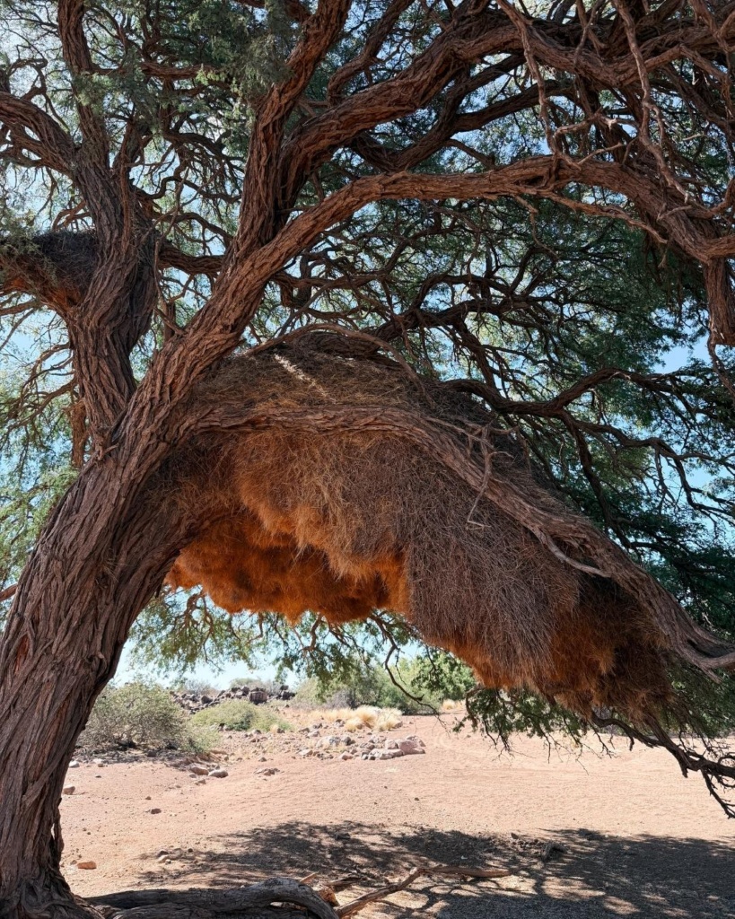 Sõitsime kämpingualal ringi ning parkisime oma auto ühe hiiglasliku puu varju. See oli üks ala tagumistest parkimisplatsidest. Tegelikult oli see küll juba hõivatud, aga me ei teinud sellest suurt numbrit. Häid ööbijaid mahub ju palju ühe puu alla. Jagasime ööbimiskohta suure hulga pisikeste lindudega. Kui lähemalt tuttavaks saime, tuli välja, et tegu on ühis-kangurlindudega. Neid võib leida Lõuna-Aafrikas, Namiibias ja Botswanas. Need linnukesed ehitavad liitpesi, mis on lindude seas üldiselt väga haruldased. Nimelt on siis tegu kõige suurejoonelisemate ehitistega, mida ükski lind ehitada suudab. Lind ise on üsna varblasele sarnanev, pruunikas ja pisike. Meist nad end igatahes häirida ei lasknud. Sajad pisikesed linnukesed puu all keksimas ja siis jälle oma lossi lendamas. Ju on nad siis külalistega harjunud. Väga lahe on sellist suursugust pesa nii lähedalt näha! Ja veel selle juures öö mööda saata!