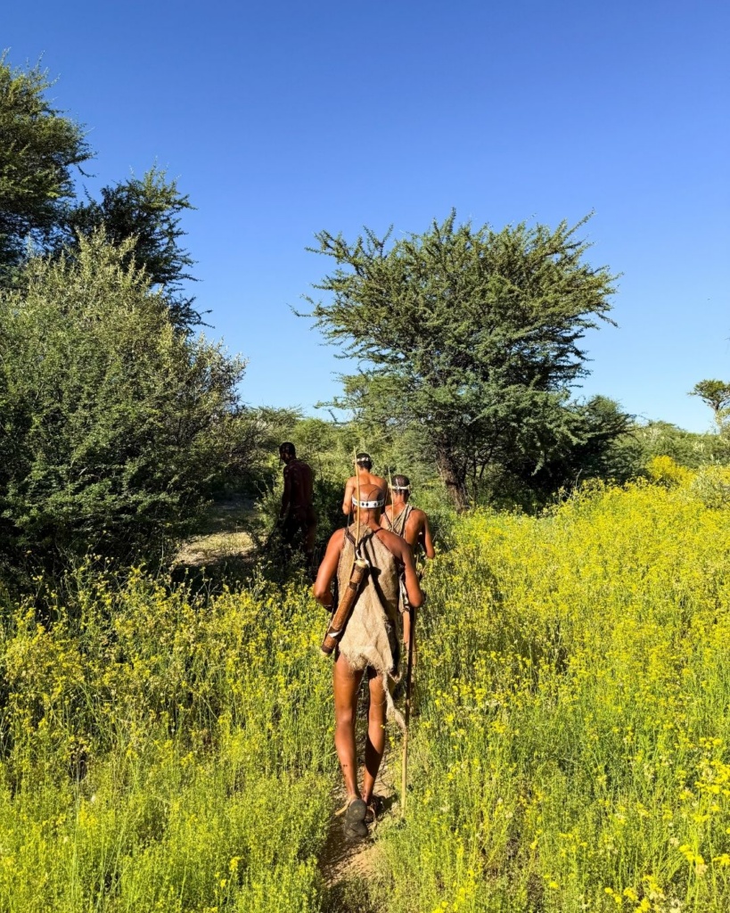 Jõudsime kohale! Bushmenide tuurijuht võttis meid vastu. Liikusime eemale, padrikusse. Seal ootas meid neli kohalikku meest. Oleksime sattunud just kui nende igapäevaelu keskmesse. Nende kehasid katsid napid riided ning nad rääkisid kohalikus keeles. Keegi neist ei mõistnud inglise keelt. Mehed tutvustasid meile enda kohalikku elu. Näitasid, kuidas nad jaanalinnu munakoored maha matavad ning seal sees joogivett külmas hoiavad. Kuidas nad erinevate looduses kasvavate taimedega oma keha eest hoolitsevad ning kuidas esivanemate hingedega suhtlevad. Mida nad teevad kõhuhädade korral ning kuidas loomi kütivad.